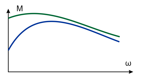 В бытовых швейных машинах может быть установлен или коллекторный двигатель переменного тока, или двигатель постоянного тока с последовательным возбуждением. Если сравнить графики зависимости крутящего момента таких двигателей от числа оборотов, будет видно, что у двигателя постоянного тока пусковой момент больше и, вообще, на низких оборотах моментная характеристика пройдет выше чем у двигателя переменного тока и будет ближе к идеальной прямой.