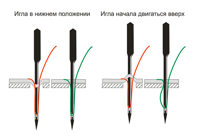 На нижнем рисунке красная нитка заправлена в машину с большим отверстием в игольной пластине, а зеленая нитка — в машину с маленьким отверстием. После прокола ткани иглой, ткань увлекается в отверстие в игольной пластине, причем, чем тоньше и эластичнее ткань, тем больше выражен эффект. В момент начала обратного хода иглы, ткань поднимается вверх и увлекает за собой игольную нить. Петля не получается, носик челнока ее не захватывает и машина пропускает стежок. Даже если стежки не пропускаются, такая болтанка ткани приводит к видимой неравномерности строчки.