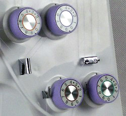 В более дорогих оверлоках применяются натяжители расположенные на одной оси. Такие натяжители обеспечивают более равномерное натяжение нитей при шитье на больших скоростях. И выглядят они современнее.