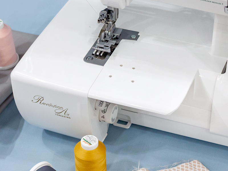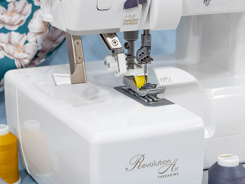 Главной особенностью данной модели является уникальная система заправки игл RevolutionAir™: благодаря вакуумному типу заправки достаточно просто опустить рычаг слева на корпусе машины, поднести нить к ушку иглы и нажать на кнопку Push To Thread Needles. Таким образом, система RevolutionAir позволяет при помощи сжатого воздуха заправлять нити не только в петлитель, но и в иглы, что предельно упростило этот процесс. А отдельный мотор насоса, который также установлен в этой модели, делает этот процесс действительно быстрым и точным.