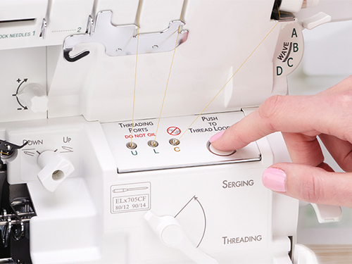 Машина оснащена эксклюзивной пневматической системой заправки нитей в петлители ExtraordinAir™, делая этот процесс невероятно простым. Также коверлок автоматически устанавливает натяжения нитей с помощью системы Automatic Thread Delivery, позволяя получить качественные строчки практически на любых материалах.
