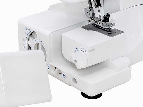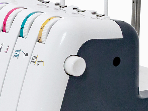 Специальная кнопка справа на корпусе оверлока помогает отключить натяжение, ослабляя прижимные диски, для легкого и свободного вытягивания нитей из-под лапки.