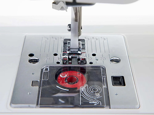 В этой машине применен горизонтальный челнок, который не требует смазки. Преимуществом этого типа является меньшее количество вибраций при шитье, в нем значительно реже запутывается нить, а заправить машину будет намного проще. Прозрачная крышка позволяет следить за количеством нити на шпульке.