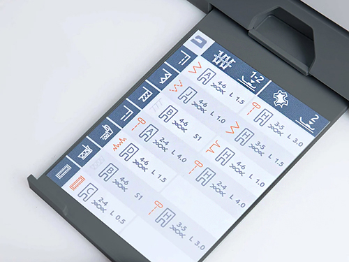 Для вашего удобства машина оборудована полезным "швейным советником" - выдвижной таблицей, которая всегда под рукой. Он подскажет рекомендуемый вид строчки и лапки, ее давление, длину стежка, ширину строчки и натяжение нити в зависимости от выбранного типа материала и швейной операции, которую необходимо выполнить.